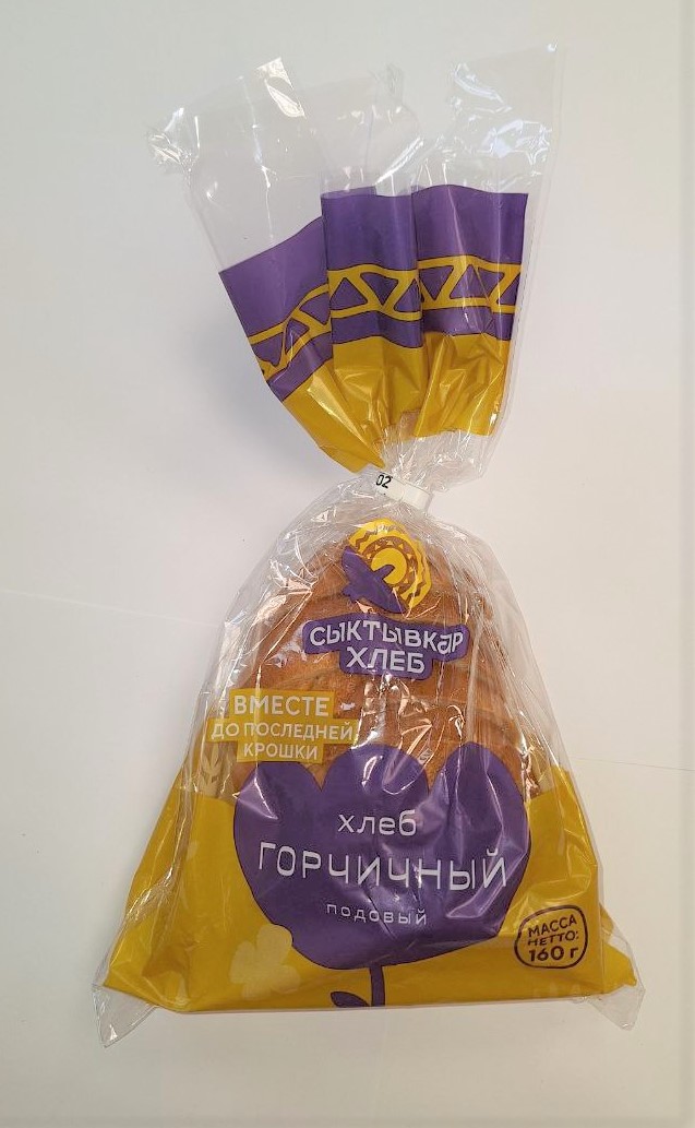 Состав: мука пшеничная хлебопекарная высшего сорта, вода, сахар, масло горчичное, дрожжи хлебопекарные прессованные, соль. Масса нетто: 0,160 кг (нарезанная часть изделия в упаковке); срок хранения 72 часа