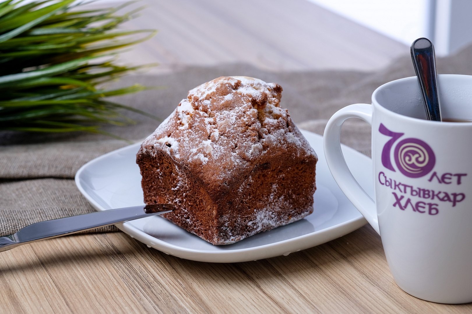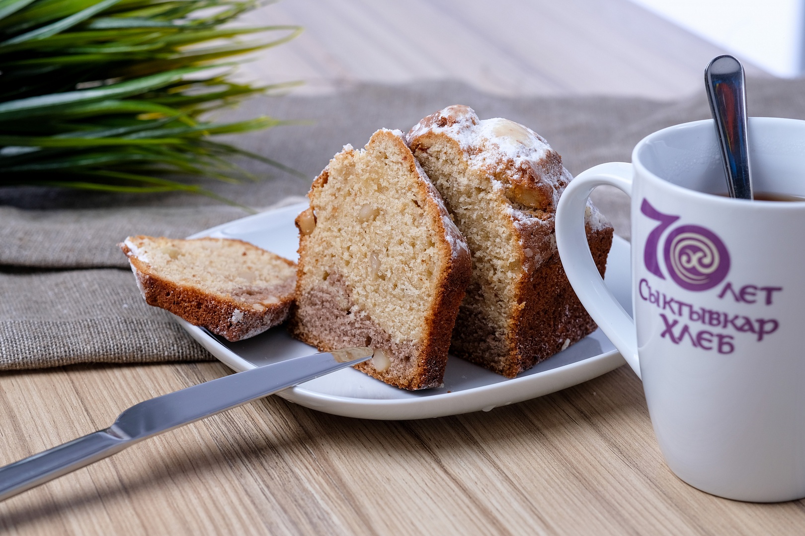 Кекс с чередованием тёмного слоя теста с какао и светлого слоя с дроблённым орехом. Поверхность обсыпана сахарной пудрой.
